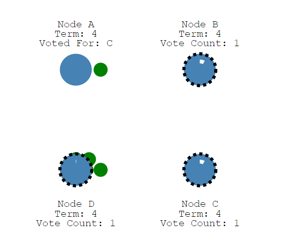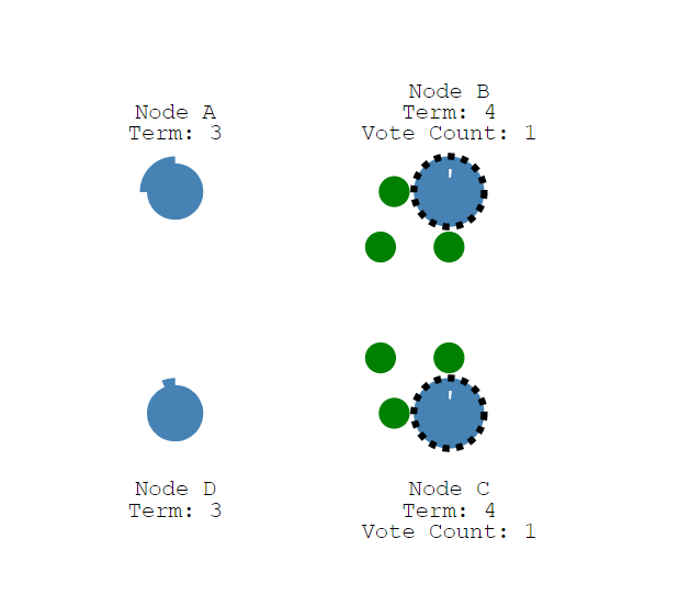 如果两个节点同时成为了候选者(时间相同的情况下),则可能会发生split vote(分裂投票)。我们来看一个四个节点的案例。