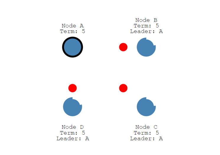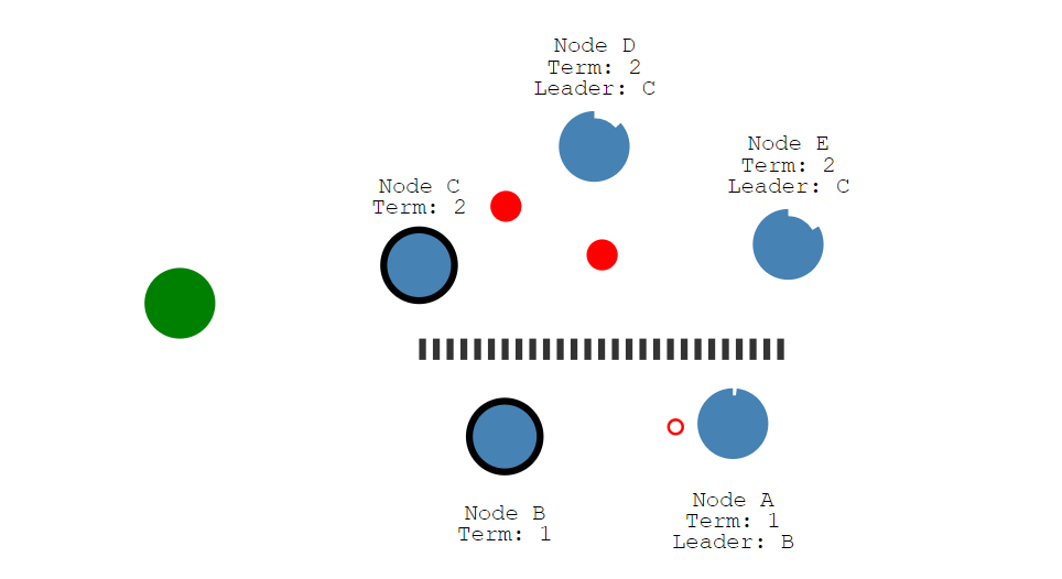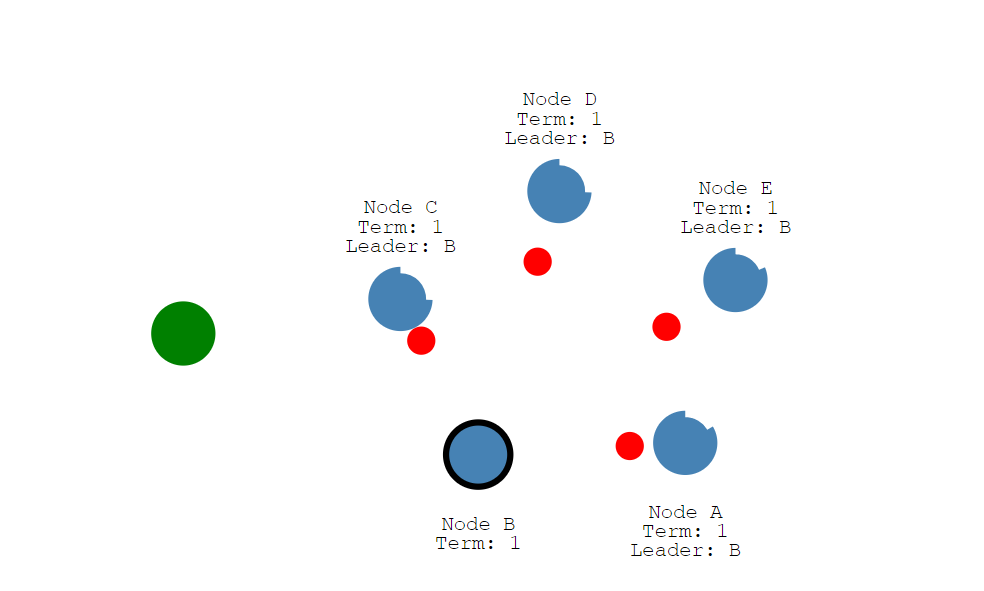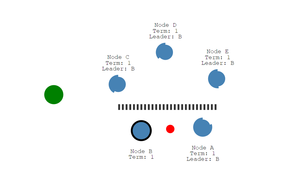此时Node B是领导者,它只能和Node A进行了通信。而另外的Node C、Node D、Node E将发生选举,确认谁是新的领导者。