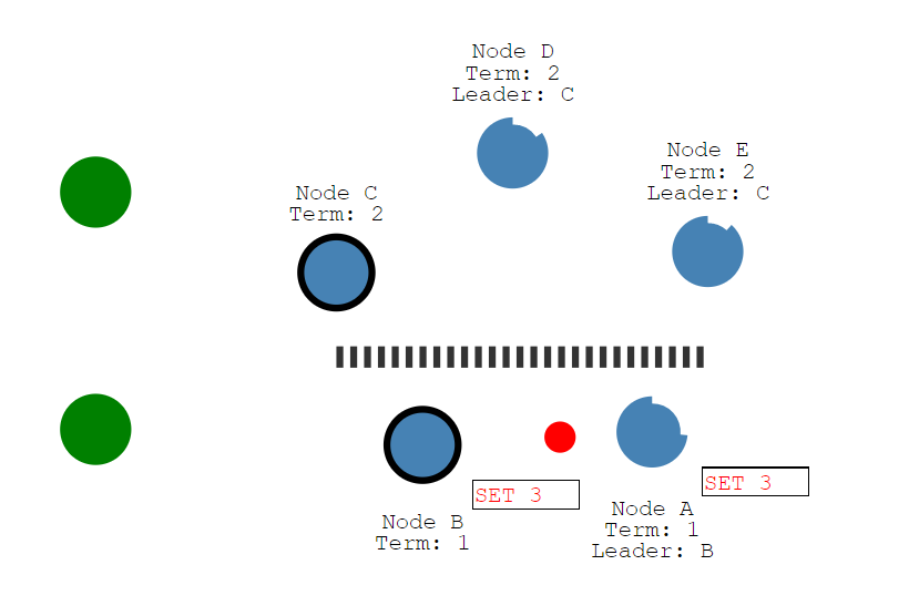 下面的绿色的客户端将Node B的值改成了3。但是问题是Node B现在没有办法复制到多数节点(只能复制到Node A),因此它的日志条目将保持为未提交状态。