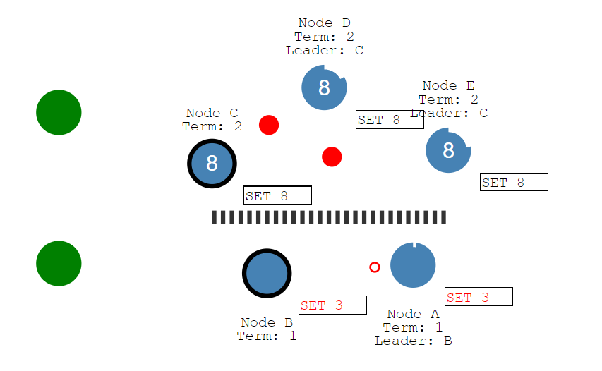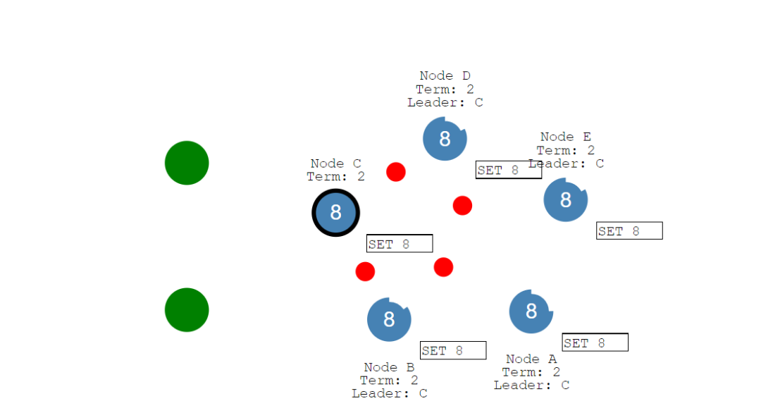 而另外一个客户端尝试修改Node C的值为8,它是可以复制到Node D和Node E的,此时它能复制到多数节点,它能成功的进行提交。