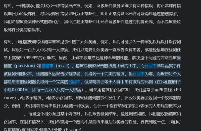 于是,我又找了深度学习的花书。通过微信读书,看到花书中对精度和召回率的描述。依旧难解。