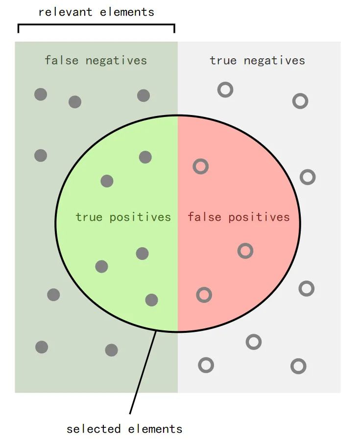 Suppose a computer program for recognizing dogs (the relevant element) in photographs identifies eight dogs in a picture containing ten cats and twelve dogs, and of the eight it identifies as dogs, five actually are dogs (true positives), while the other three are cats (false positives). Seven dogs were missed (false negatives), and seven cats were correctly excluded (true negatives). The program's precision is then 5/8 (true positives / all positives) while its recall is 5/12 (true positives / relevant elements).