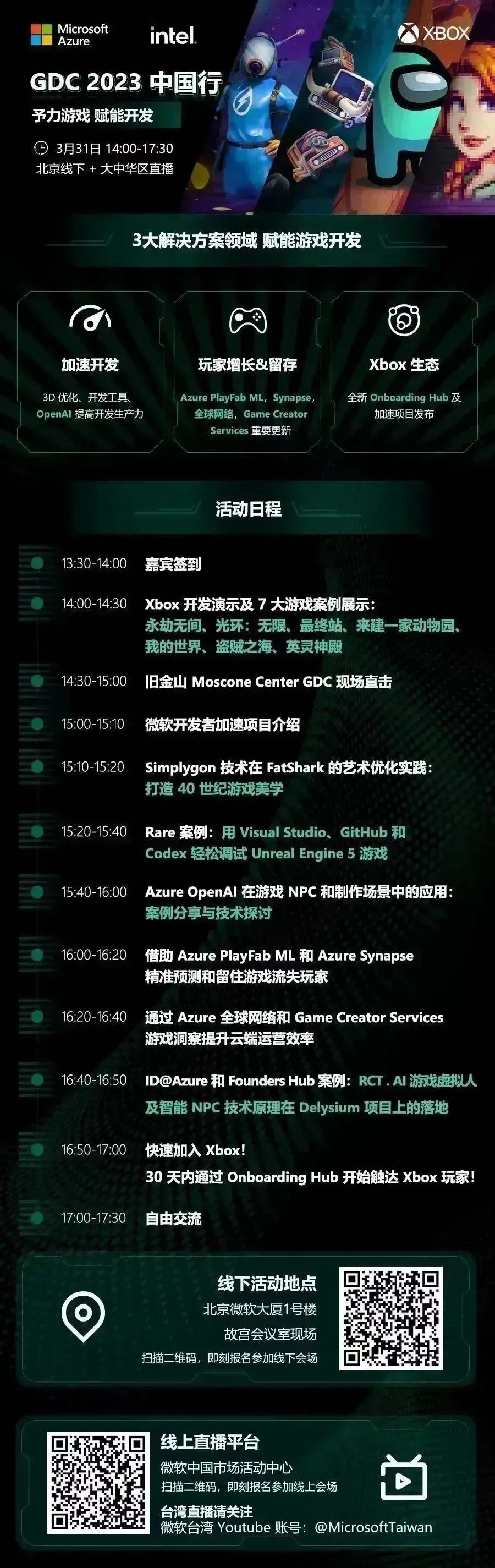 为了帮助中国开发者更好地理解GDC 2023全球站点发布内容,微软将于2023年3月31日举办GDC 2023中国行,包含北京线下会场、在线直播以及台湾地区Youtube 同步直播,届时将有微软专家针对国内游戏开发现状对发布内容进行拆解与分析,并分享关于 Azure OpenAI 服务在游戏开发中的应用场景,以启迪开发者们无尽的创造力。