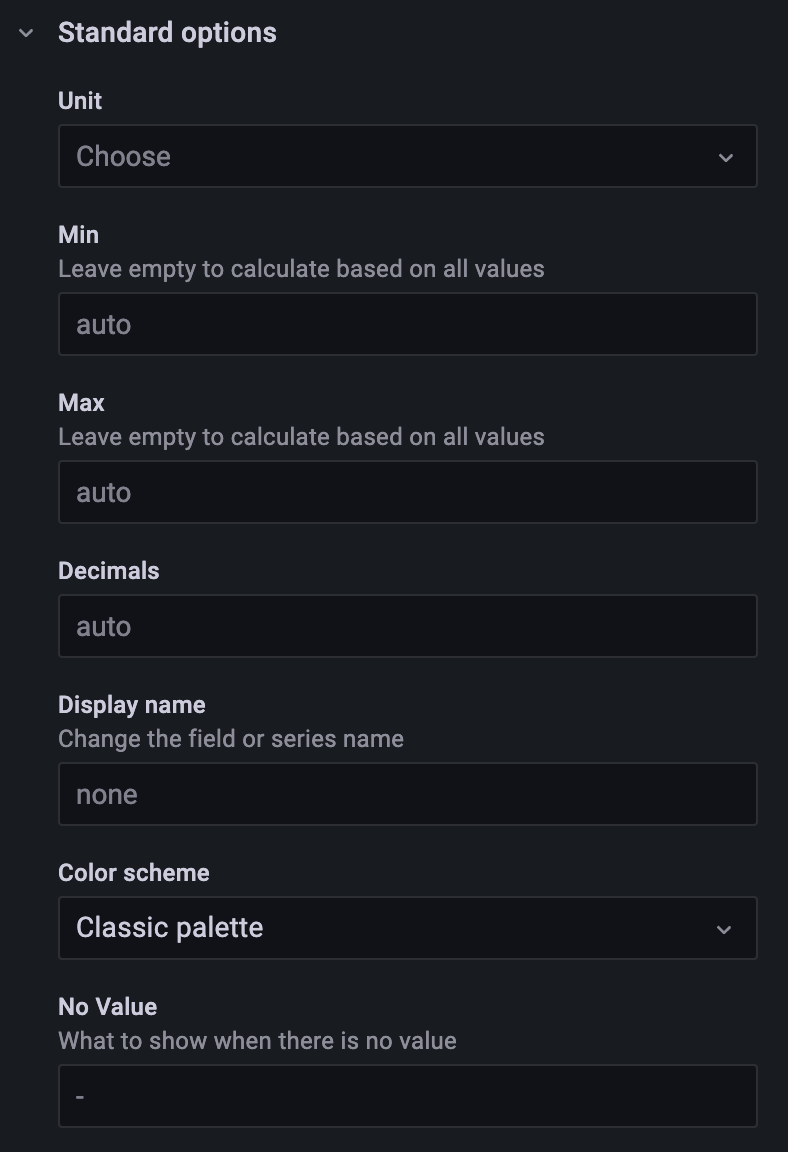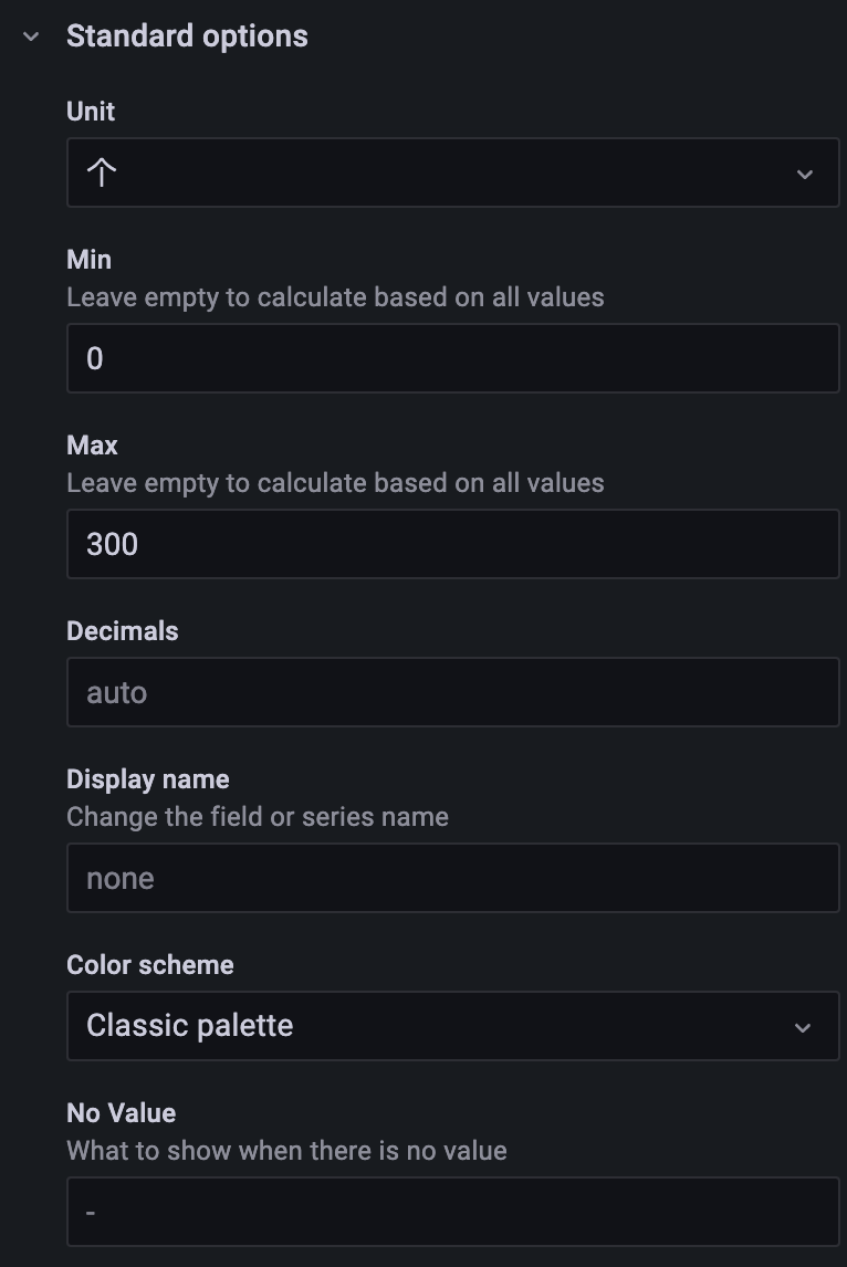 9. 在右侧的 Standard options 可以设置单位(有byte, s, ms, us, ns等等,还可以自定义)、显示最小值、显示最大值、精度、展示名称、配色(可以选择单个颜色、根据阈值或者现有配色方案)等。如下示例为自定义单位为 个,最小值设置为 0,最大值设置为 300。