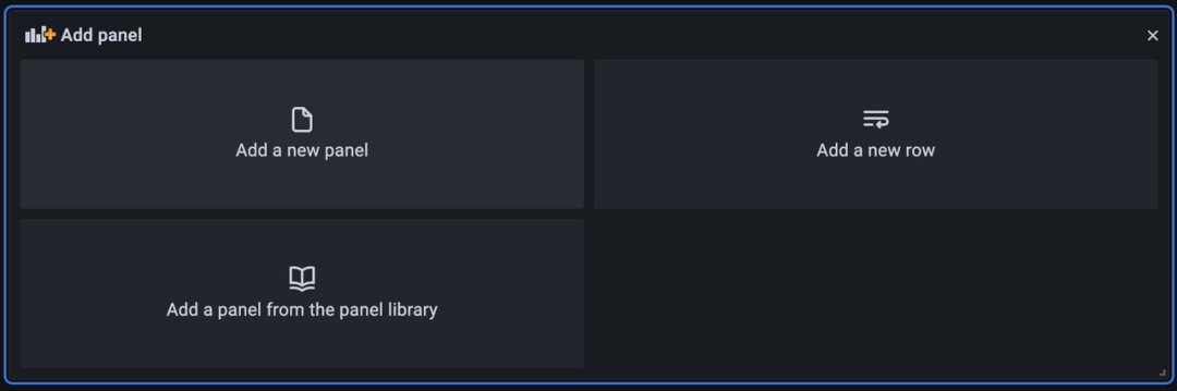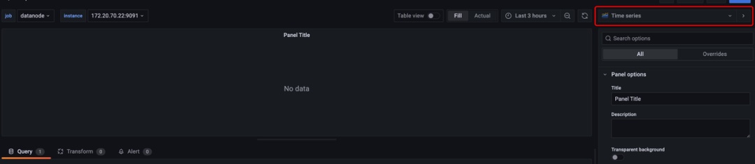 2. 点击 Add a new Panel,添加一个面板。首先点击右上角,选择当前 Panel 的类型,比较常用的有Time series(时间序列)、Stat(统计)、Gauge(寄存器)等等,可以视情况选择。