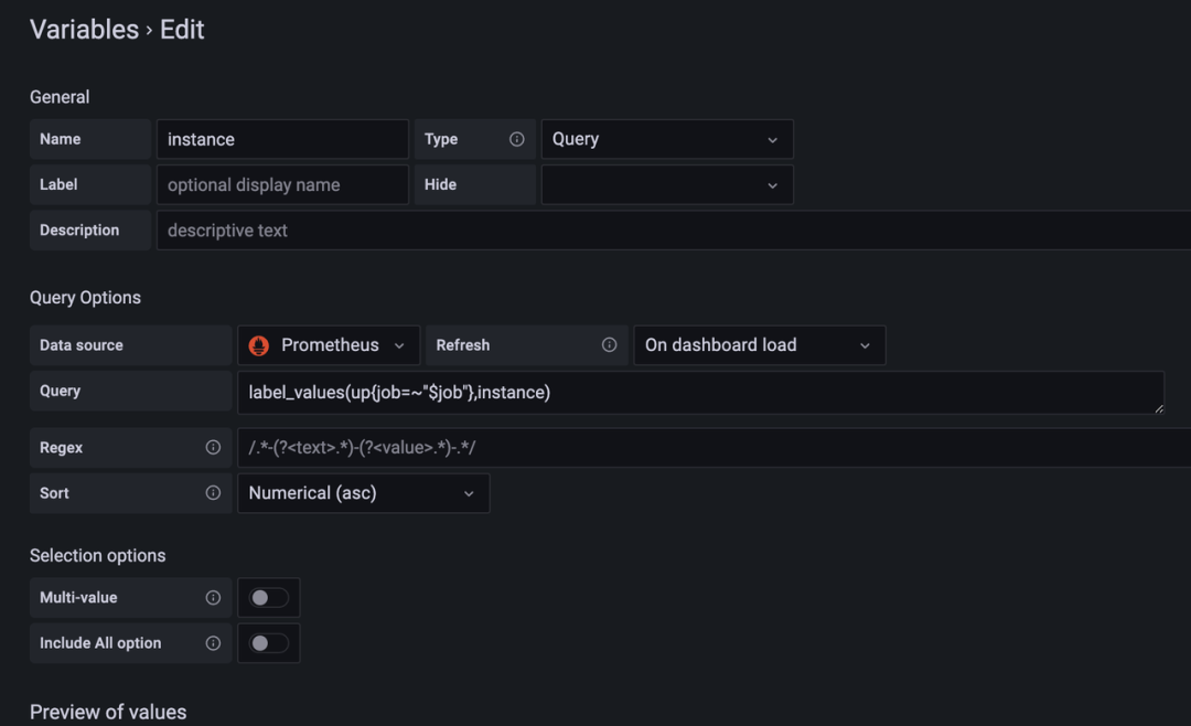 ii. 添加 instance 变量,类型为 Query,对应的 Query Options 是 label_values(up{job=~"$job"},instance)