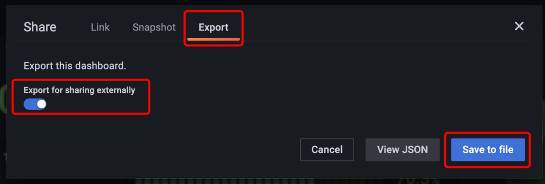 2. 点击 Export 标签页,并选择 Export for sharing externally,然后点击 save to file 就将对应的 Dashboard 的 json 文件下载到本地了。