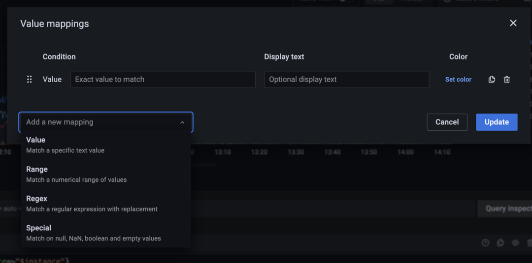 10. 在右侧的 Value mappings 可以添加对应的映射:可以根据值、范围、正则和特殊值(空等)来控制其展示的文本,比如0代表离线,1代表上线,可以通过 value mappings 完成。