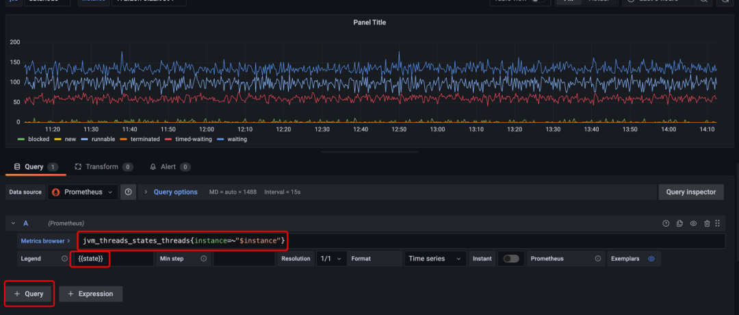 b. 在 Legend 中,可以通过双中括号访问到对应的监控项的对应 Tag 的具体值,比如在下图的例子中,state="blocked/new/runnable/terminated/timed-waiting/waiting",通过这样的方式修改图例。