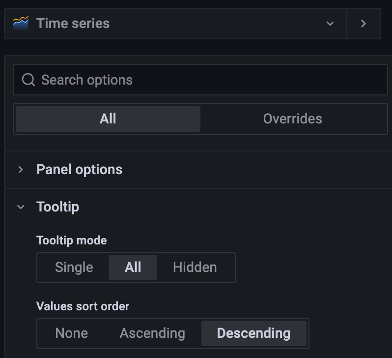 a. 在 General 界面更新 Name,Description,Tag等基础信息,调整 Panel options 为 Shared crosshair,从而保证 tooltip 可以跨 panel 使用。