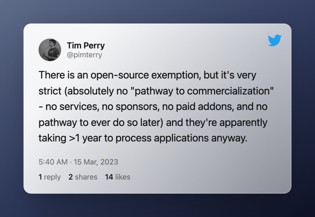 虽然提供开源豁免条款,但要求非常严苛(绝对不得「商业化」—— 不得对外提供服务、不得接受赞助商赞助、不得发布付费插件,后续也不得采取任何本质上属于这几类情况的其他盈利措施),而且往往需要一年以上才能对应用程序完成审查。