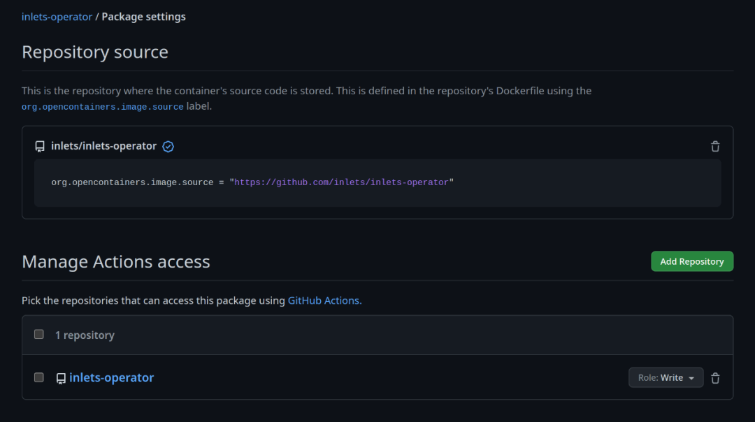 如果大家已经在 GitHub 上存储过镜像,并打算使用 GitHub 的内置 GITHUB_TOKEN 来发布新标签,则需要前往 Package 并编辑写入权限。在添加 repo 时附上 “Write” 访问权限即可。