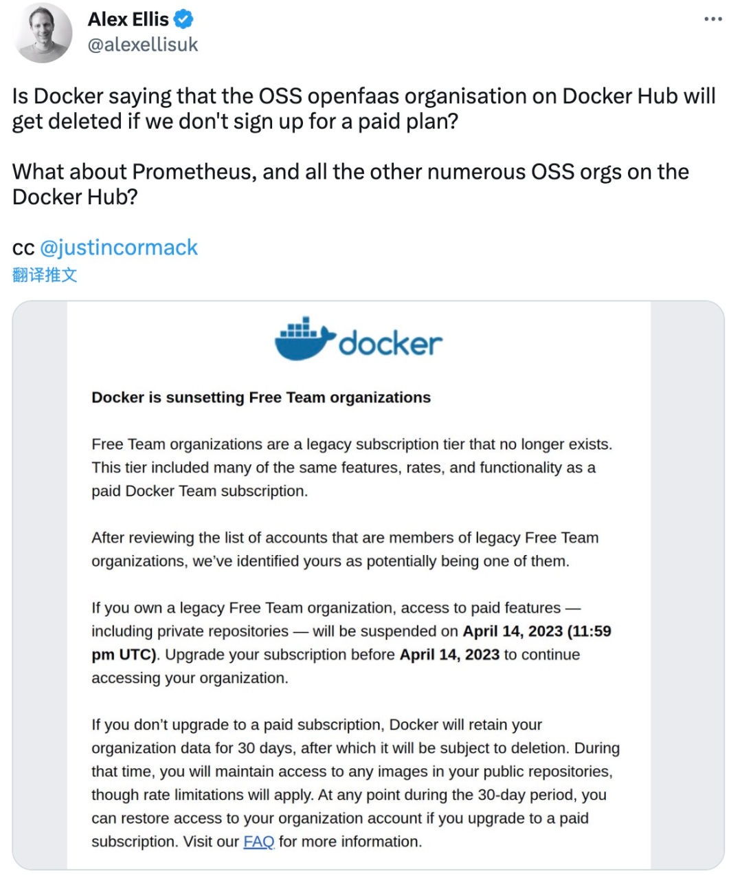 Docker 的意思,是不是如果我们不注册付费计划,Docker Hub 上的开源 OpenSaaS 组织就会被删除?
