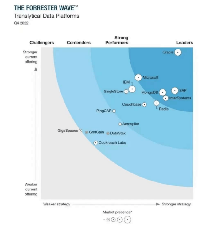 2022 年 12 月 6 日,国际权威研究机构 Forrester 发布了「Forrester Wave™: Translytical Data Platforms, Q4 2022 」报告,通过 26 项指标对全球 15 家主要的 Translytical 平台展开评估,包含 IBM、微软、Oracle、SAP 等成熟供应商,以及 Singlestore 、PingCAP 等新兴厂商。