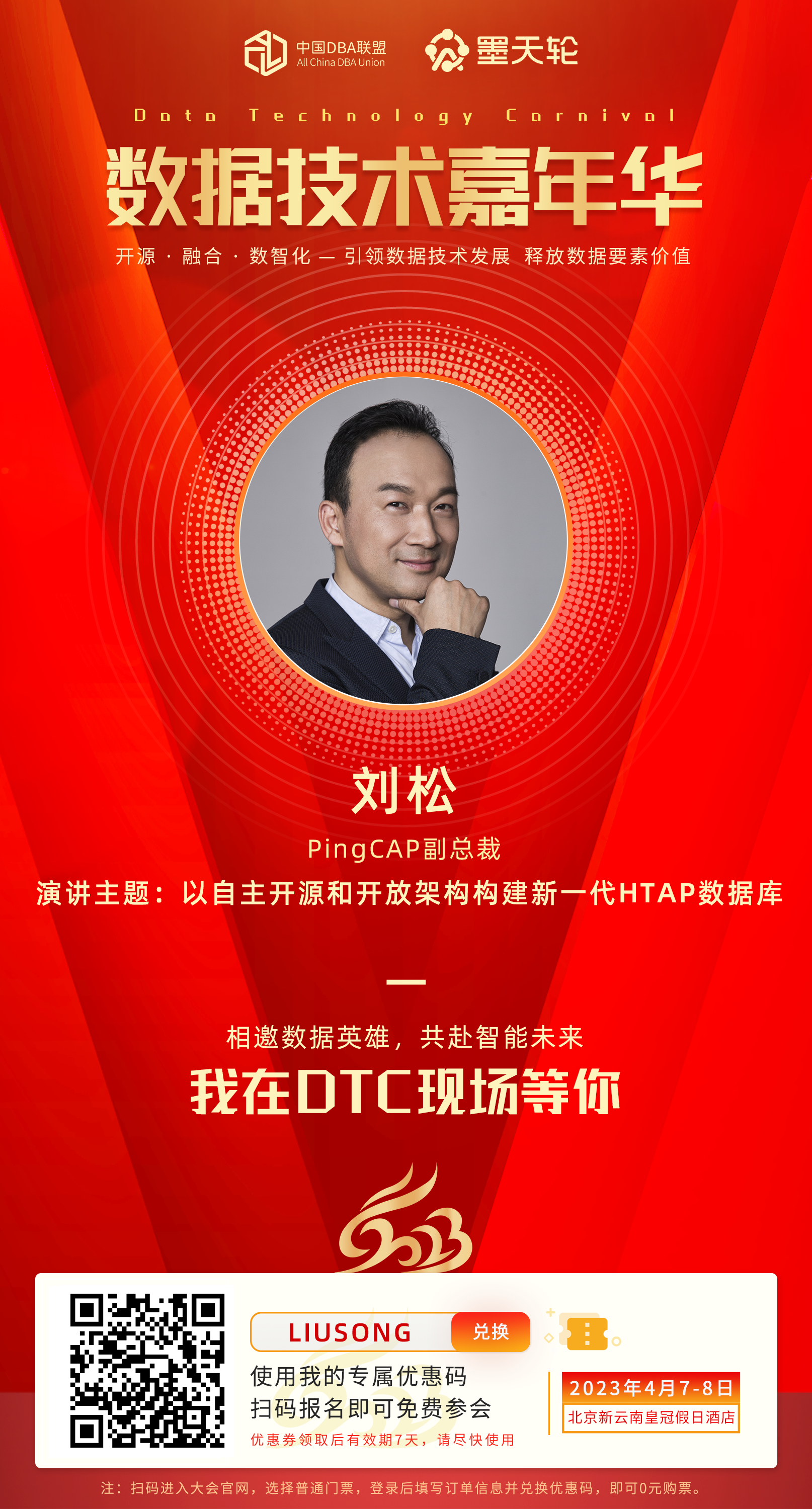 想要了解更多有关TiDB的产品能力和解决方案嘛?PingCAP 副总裁刘松将于4月7日,第十二届『数据技术嘉年华』专题论坛『引领发展:中国数据库创新』带来题为《以自主开源和开放架构构建新一代HTAP数据库》的主题演讲,将从业界者的视角分享演讲人对全球数据库的产业趋势洞察,解读数据赛道和行业机会和沟壑,通过诠释TiDB过去两年在HTAP、云原生、Serverless化的技术演进和全球市场的拓展模式来分享国产数据创新路径的思考。在购票时使用海报上方优惠码即可0元购取普通门票一张,我们期待与您在线下交流!