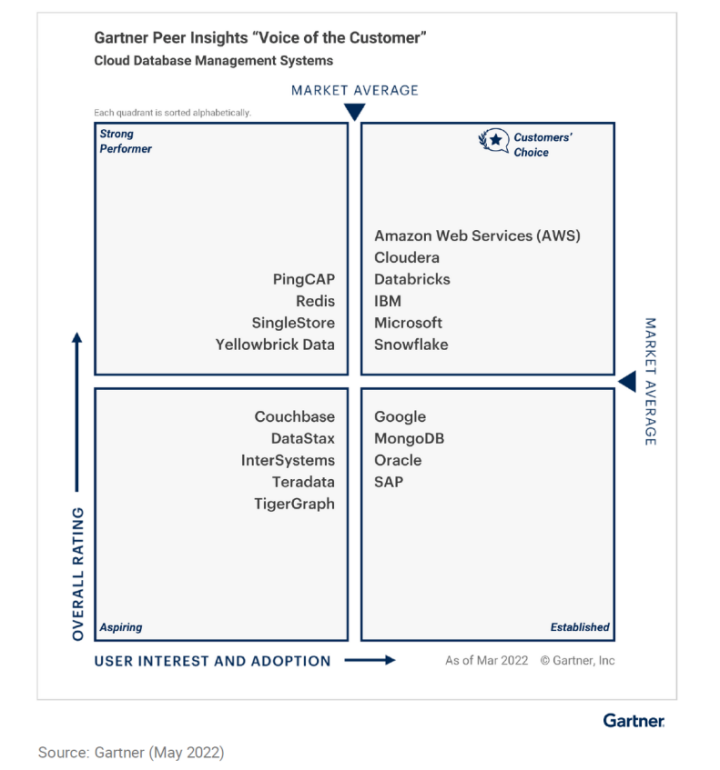 2022年6月,全球权威信息技术研究与咨询机构 Gartner 发布了云数据库市场领域 2022 Gartner® Peer Insights™ “Voice of the Customer” 报告,PingCAP 是唯一入选的中国分布式云数据库服务商,客户总体评分达到 4.7 分(满分 5 分),在所有入选企业中位列第一。