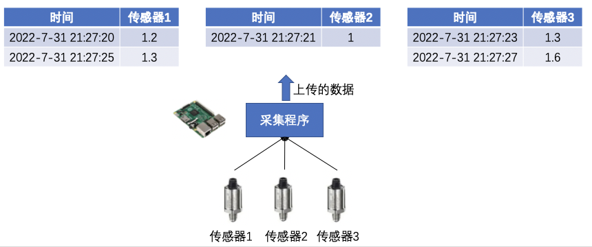 (1)第一种场景:设备上的一个程序定时获取每个传感器的值,都拿到之后,打上一个时间戳。这种方式拿到的多个时间序列能共用一个时间戳。我们可以叫这种序列为同时采集。