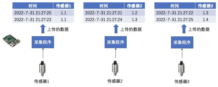 (2)第二种场景:每个传感器都对应一个采集程序,上传数据的时候打上时间戳,这种方式很可能不同序列采集的初始时间或者采集频率不同,导致多个序列的时间戳不能共用。我们可以叫这种序列为独立采集。