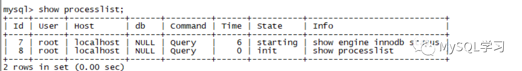 因此如果show engine语句在打印innodb信息的时候出现了很慢的情况,show processlist 看到的应该是starting,如下: