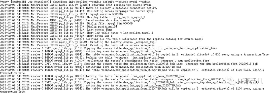 (venv) [omn@tidb1 logs]$ chameleon create_replica_schema --config default --debug