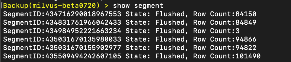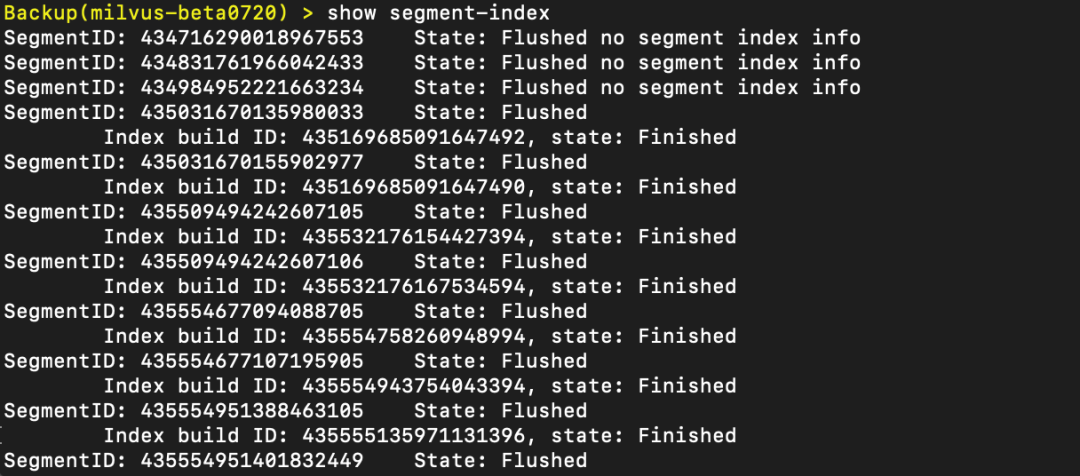 展示 segment 索引的状态,可以看出索引是否被创建;命令后可加--collection 或 --segment 进行过滤。