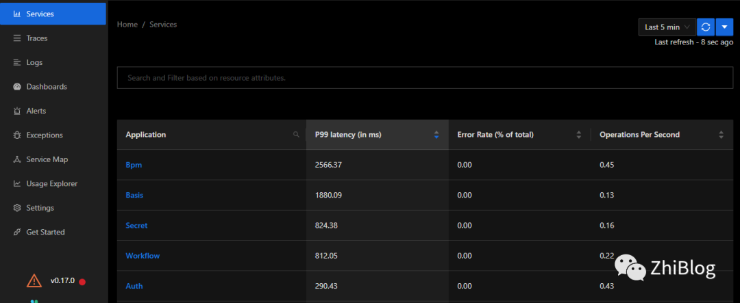 此页面概述了您的应用程序的运行状况和性能。它以表格形式显示您的应用程序列表,对于每个应用程序,SigNoz 显示上述 RED 指标。