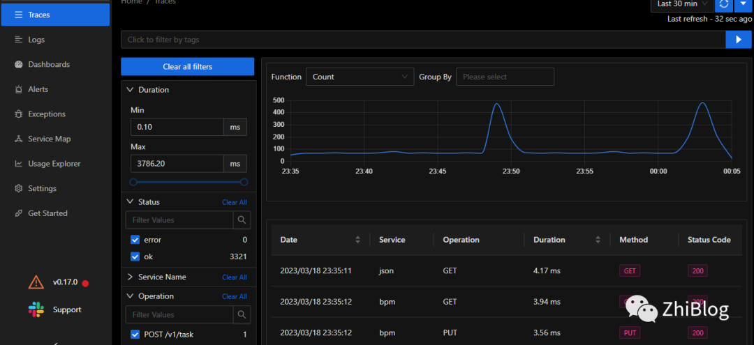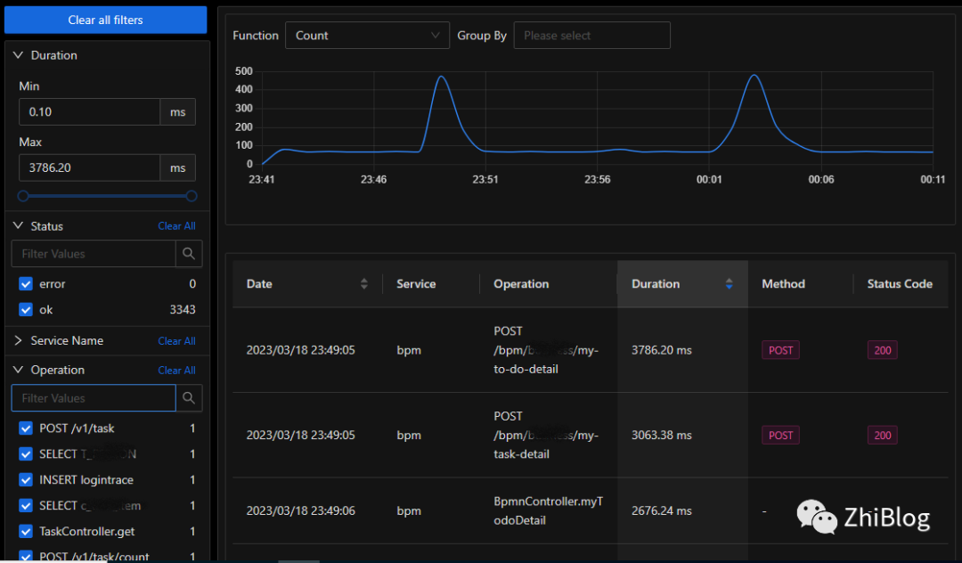 在Traces页面上,您可以在请求通过应用程序的各个组件传播时查看和分析请求,并了解用户的体验。如下跟踪具体接口使用情况:
