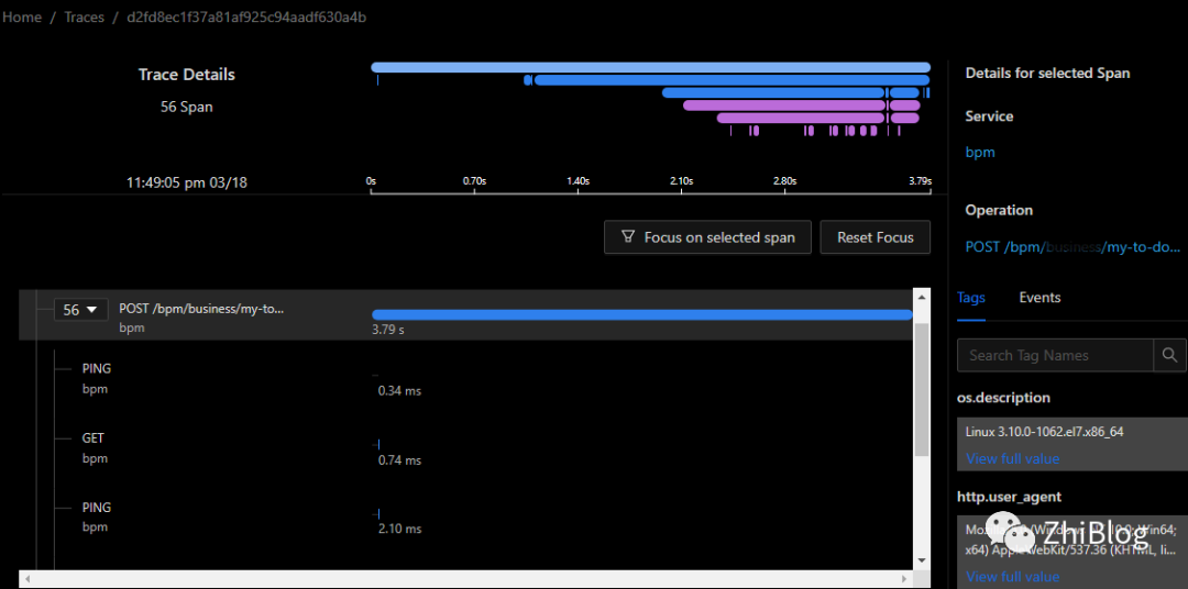 轨迹由一个或多个跨度组成。第一个跨度表示根跨度。每个根跨度表示从开始到结束的一个请求。父级下面的Spans提供了一个更深入的上下文,说明请求过程中发生了什么(或者组成请求的步骤)。