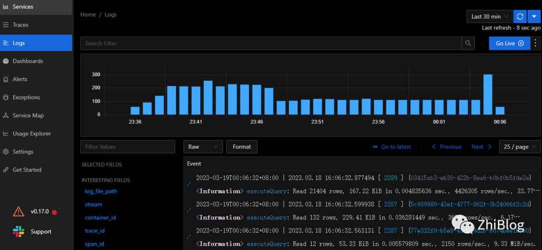 Logs是由服务或其他组件发出的带有时间戳的消息。然而,与Traces不同的是,它们不一定与任何特定的用户请求或交易相关联。它们在软件中几乎无处不在,并且在过去一直被开发人员和操作人员严重依赖,以帮助他们了解系统行为。