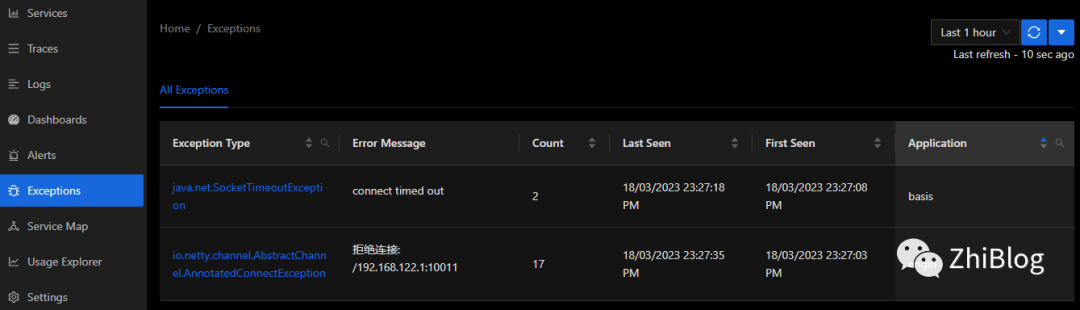 查看Exceptions异常情况