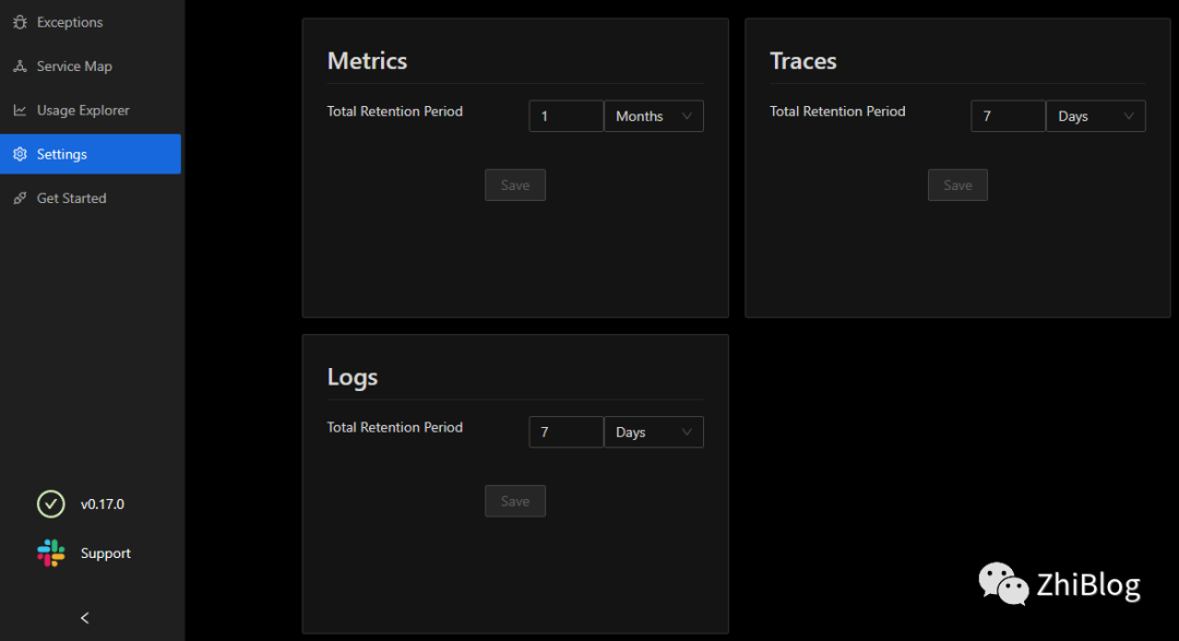 默认情况下,日志和跟踪的保留期设置为 7 天,指标的保留期设置为 30 天。要为指标、跟踪和日志设置保留期,您可以导航到页面General上的选项卡Settings进行配置。