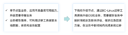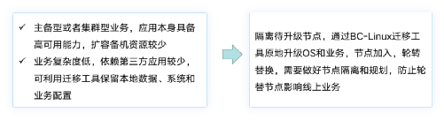 BC-Linux 迁移工具在原地迁移和滚动迁移场景中均可使用,用户可使用 BC-Linux 迁移工具对业务软件兼容性进行评估,根据业务需求选择不同的搬迁策略: