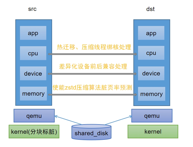 「热迁移效率提升」:通过并发迁移提升整体迁移速度,使用 zstd 压缩算法,减少数据传输量,缩短单个虚机迁移时间,有效提升热迁移效率。 「热迁移线程绑核」:将迁移和压缩线程绑定至空闲物理核,保证迁移和压缩线程不会和 vcpu 线程争抢 cpu 资源。降低数据传输的带宽抖动,使得迁移和压缩线程能高效平稳运行。 「热迁移脏页率预测」:对于高脏页率的虚机,根据内存监控的脏页率预测数据,可在脏页率预测值不高时再迁移,进一步提升了热迁移成功率。