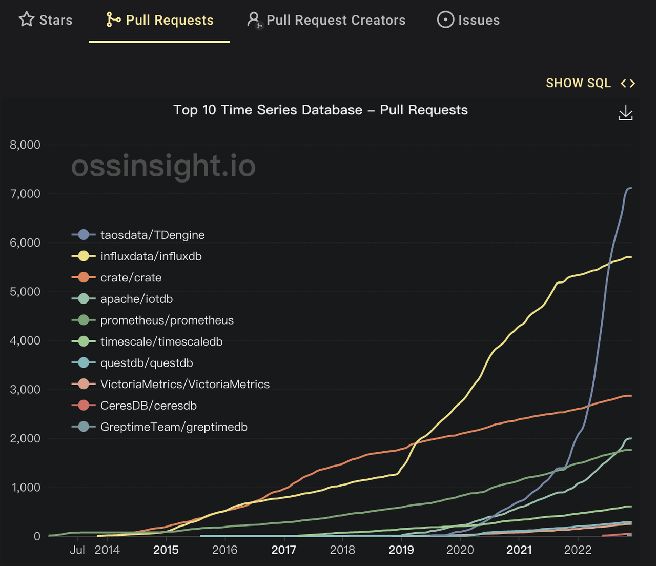 对于种种猜测,涛思数据交出了一份令所有人震惊的答卷:TDengine上线仅3个月,star数量破万!到目前开源仅仅才发展了三年时间,star 数已经达到了 20.9k,且多次登顶 GitHub 全球趋势排行榜, TDengine 也已成长为时序数据库领域 star 数排名第三的新星项目,并在全部开源数据库产品中,位居第六。在 2022 年,中国开发者个人贡献 Top 20 中,就有四位是来自涛思数据的开发者。