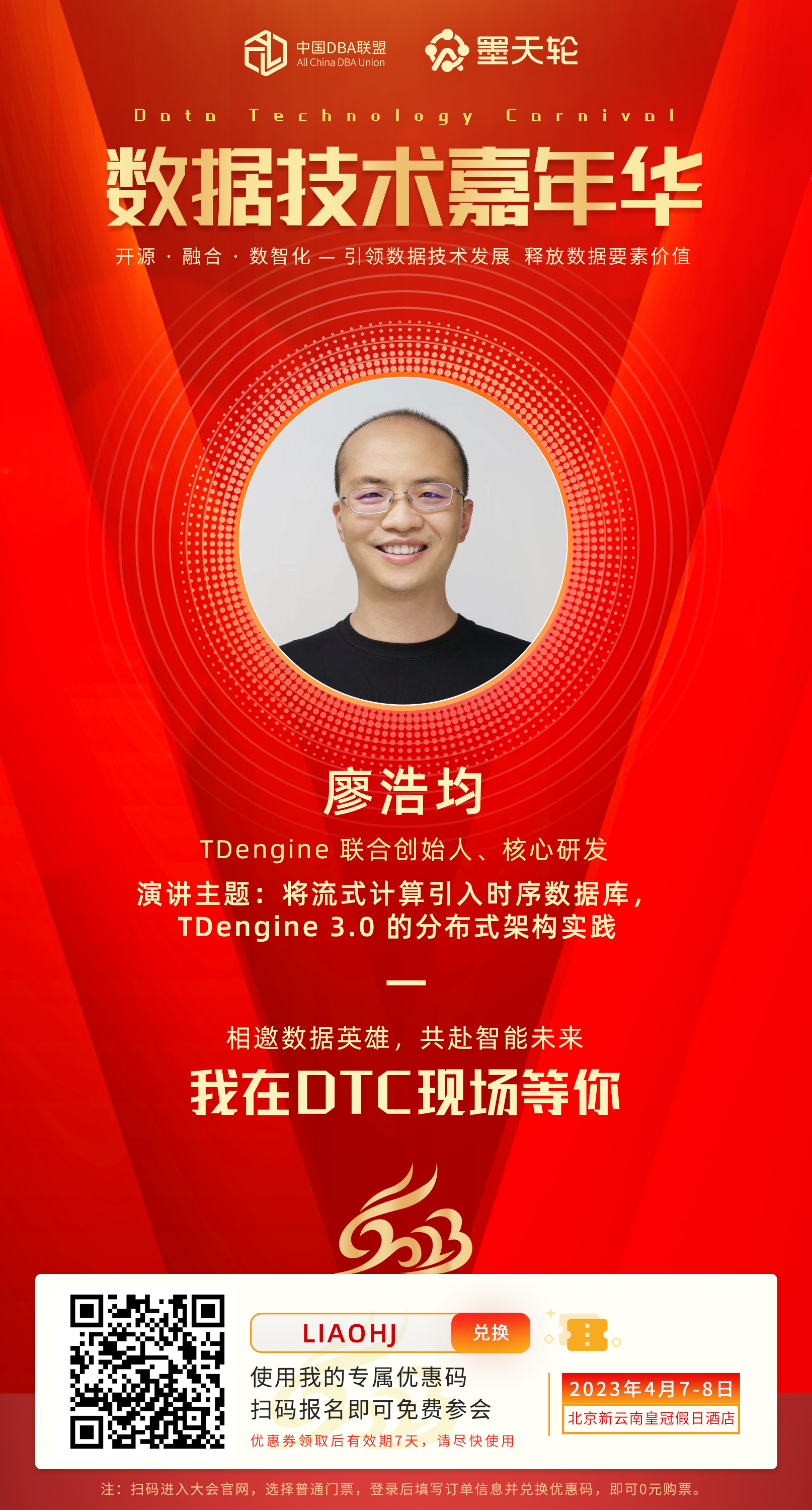 中国科学院计算技术研究所博士廖浩均作为涛思数据的联合创始人,在涛思主导 TDengine 查询计算引擎的研发,他将在4月8日的第十二届『数据技术嘉年华』专题论坛『开源自研:分布式数据库』上为我们带来题为《将流式计算引入时序数据库,TDengine 3.0 的分布式架构实践》的主题演讲,主要介绍 TDengine 3.0 中引入的以事件时间为基准的实时流式计算功能的实现和其全新的分布式架构。使用海报上方专属优惠码即可在嘉年华官网购票时0元购取普通门票一张,数量有限,先到先得!