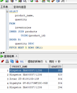 -- 以下查询语句仅能在Oracle 12c以上版本执行SELECTproduct_name,quantityFROMinventoriesINNER JOIN productsUSING(product_id)ORDER BYquantity DESCFETCH NEXT 5 ROWS ONLY;
