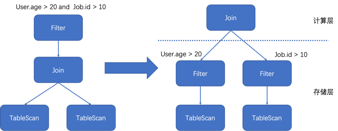 在我们的常规认知中,过滤条件肯定是推的越靠近底层越好,将尽可能多的过滤条件更贴近数据源,以使查询时能跳过无关的数据,在AnalyticDB MySQL中,由于存储计算分离架构,那么谓词下推就是把所有能推的谓词都推到存储节点上去做。比如下图,所有的过滤条件都推到存储节点上去做,这样减少了后续算子的计算量,也减少了中间网络传输的数据量。谓词下推带来了很多的好处,基本上所有数据库,都会把谓词下推作为他们重要的优化功能。