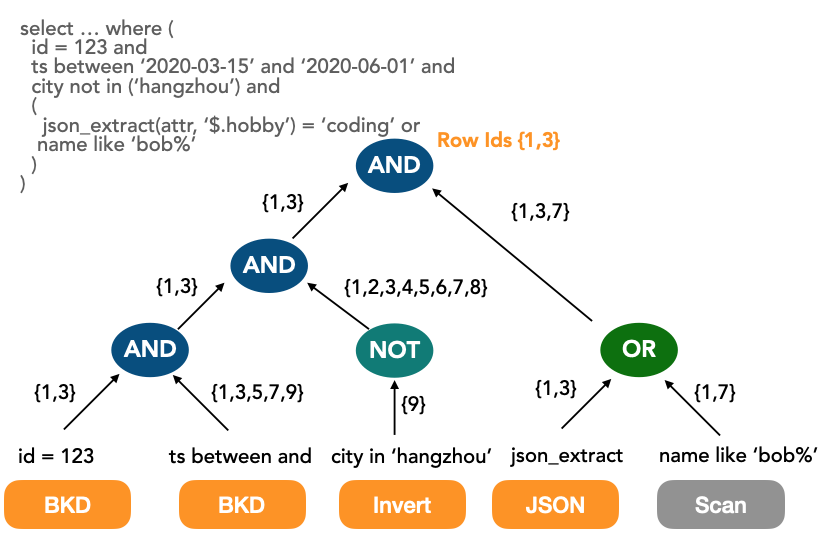 为了弄清这个问题,我们先来看一下AnalyticDB MySQL的存储节点的索引结构。ADB目前默认是全索引,即会为所有列创建索引,并且支持多个条件同时走索引,快速多路合并,能够在毫秒级别找出满足条件的结果集。下图展示了一个表上多个过滤条件的索引查找过程。可以看到是每一列都会查找索引,最后将RowIds做交并差集运算。了解完索引结构后,我们构造一个简单的例子,来说明过滤条件下推到存储之后却变慢的情况。我们简单假设一个代价模型,每一行扫索引的代价是A,每一行取明细以及数据传输的代价是B,计算层每一行过滤的代价是C。并考虑如下sql。create table user (age int, id int);