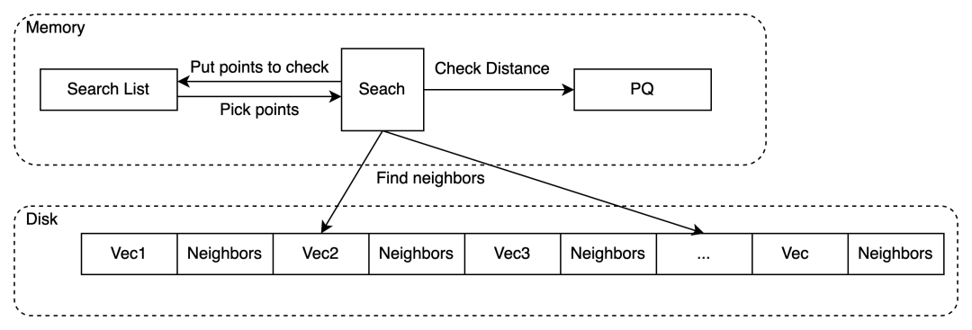 用 PQ 计算这些邻居到目标点的距离,择优放进 Search List(类似于 Priority Queue)。