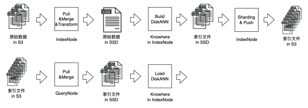 Build 时,IndexNode 会从 MinIO 里抓取原始数据,预处理后放入本地磁盘。然后 DiskANN 会从磁盘中读取文件并生成索引文件。最后由 IndexNode 把建好的索引文件处理后推到 MinIO 里。