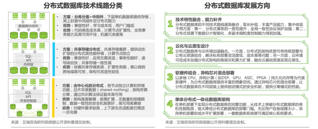 根据报告,分布式数据库是通过计算机网络将物理分散的多个数据库单元连接组成的逻辑上统一的数据库。目前分布式数据库的技术路线分为三类:分库分表+中间件方案、共享存储分布式数据库、去中心化的分布式数据库。当下分布式数据库市场产品繁多,但其技术特性逐渐趋同,从两个角度分析:其一,系统架构。存储采用开源或者自研内核,用一主多从的数据副本保证数据完整性,计算通过SQL语句解析分发和结果汇聚,管控用于保证各模块的高可用和故障切换等管理功能。其二,开源和自研两条研发线路。开源主要基于MySQL 和PostGreSQL,难点在于源代码改造的技术难度大;自研周期长且技术要求高,国内完全自研产品屈指可数。未来分布式数据库的核心竞争要素为分布式事务的稳定性、产品全面性以及生态工具的完备性。