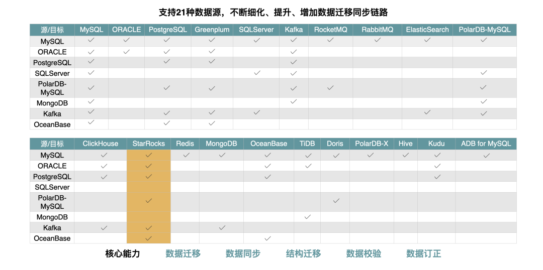 CloudCanal 的核心功能包括数据迁移和数据同步,并且具备结构迁移、数据校验、数据订正的能力。目前支持21种主流数据源,并且在不断细化、提升、增加数据迁移同步链路。