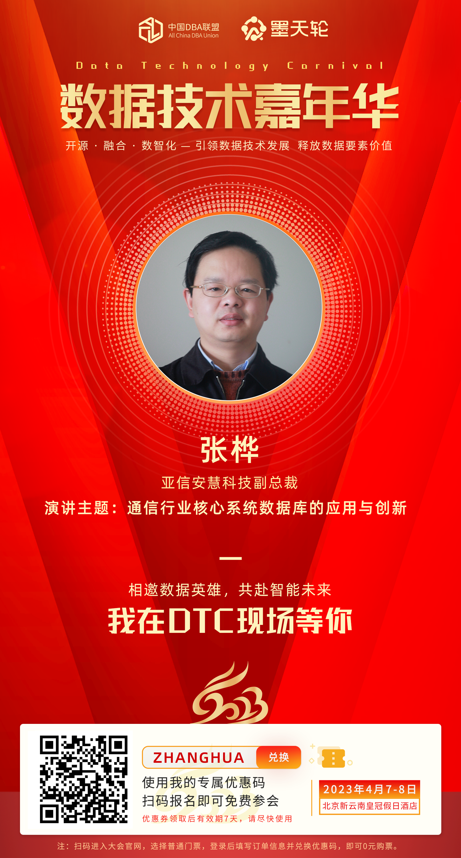 亚信安慧科技副总裁张桦先生作为 AntDB 数据库的研发带头人,从2008年移动计费核心改造之初就参与了 AntDB 的研发设计工作,亲眼见证了中国通讯市场从2G向5G发展的全部历程,也经历了运营商行业国产化替换从首次落地向大规模推广的整个阶段。作为我国数据库领域的核心专家,张桦先生在数据库领域和垂直行业应用方面有近20年经验。2023年4月8日,张桦先生将亮相第十二届 『数据技术嘉年华』,带来《通信行业核心系统数据库的应用与创新》主题演讲。墨天轮诚邀您莅临现场,一起了解行业动态,洞悉数据库行业发展。