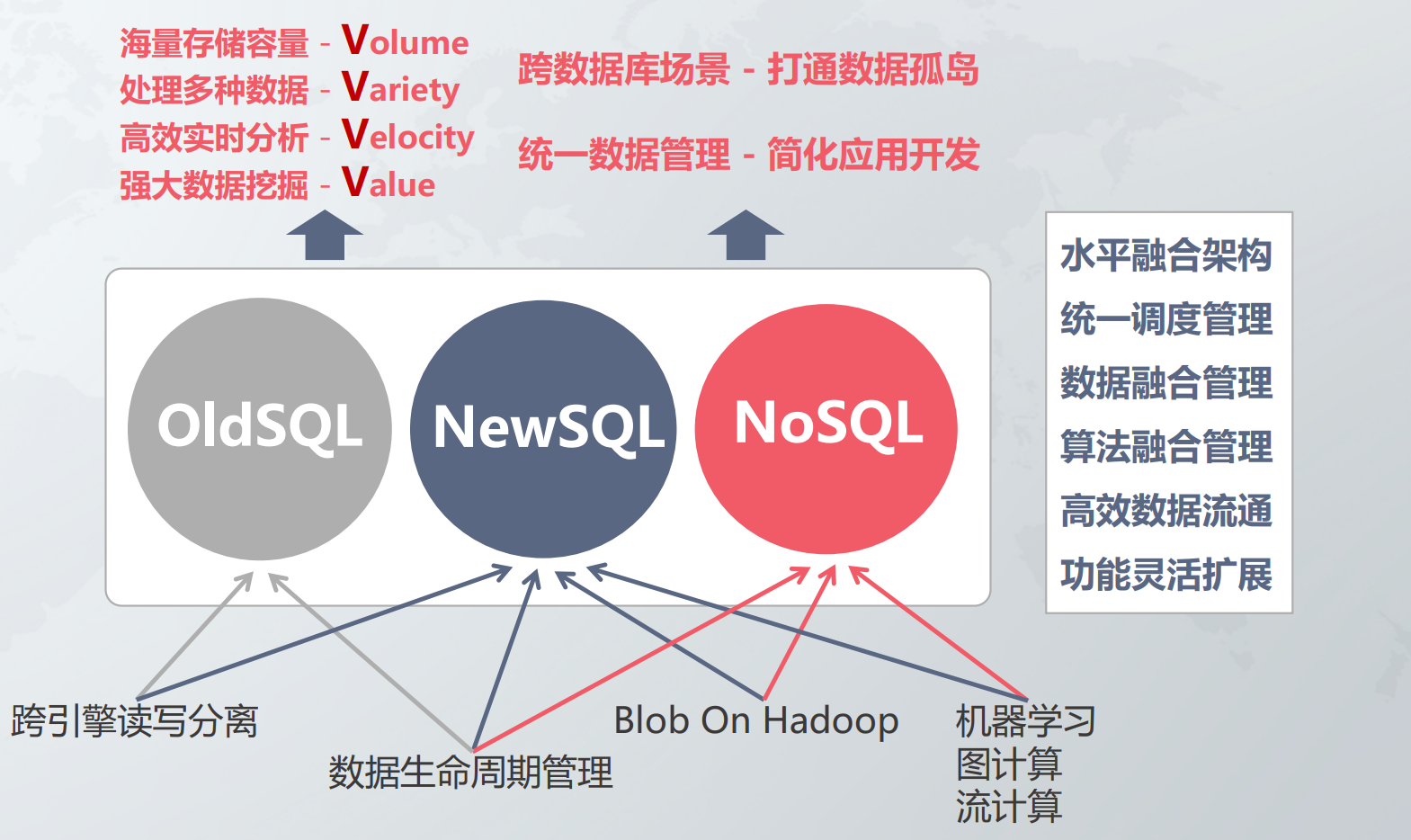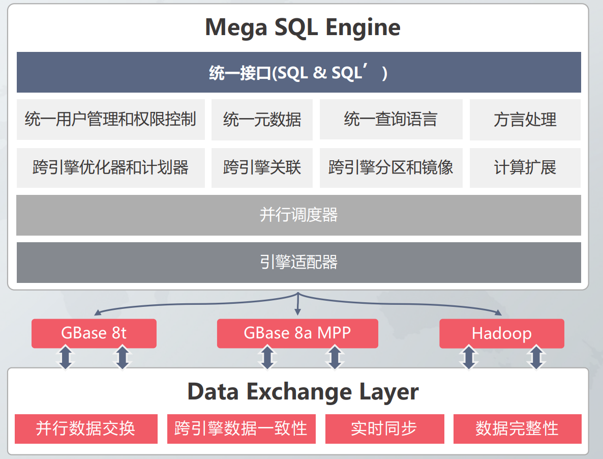 异构引擎透明访问 简化应用开发,降低数据建模的复杂度 跨引擎数据交换 高吞吐率的多对多通讯机制 跨引擎关联查询 实现自动优化的引擎间关联分析 BLOB on Hadoop 扩展非结构化数据存储和计算能力