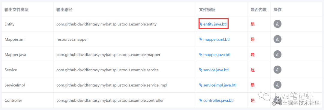 - 输出配置: 对需要生成的相关代码,比如Entity、Mapper、Servcie、Controller等代码模板信息进行配置,用于在转换时调用。