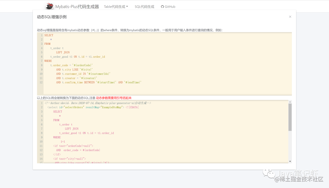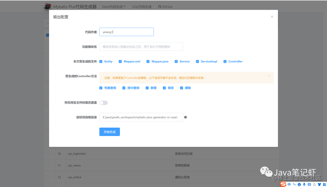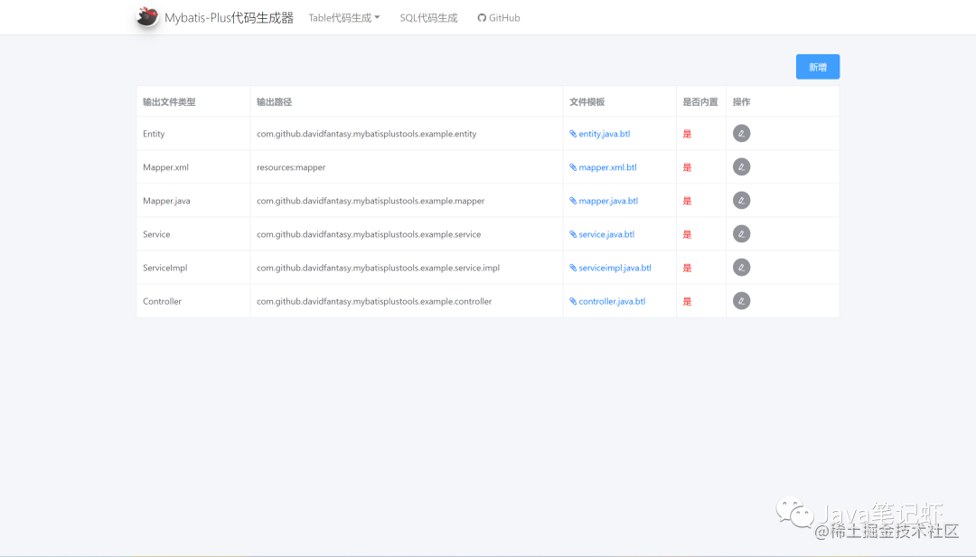 它是对mybatis-plus-generator进行封装,通过Web UI快速生成兼容Spring boot,mybatis-plus框架的各类业务代码。提供交互式的Web UI用于生成兼容mybatis-plus框架的相关功能代码,包括Entity、Mapper、Mapper.xml、Service、Controller等,可以自定义模板以及各类输出参数,也可通过SQL查询语句直接生成代码。