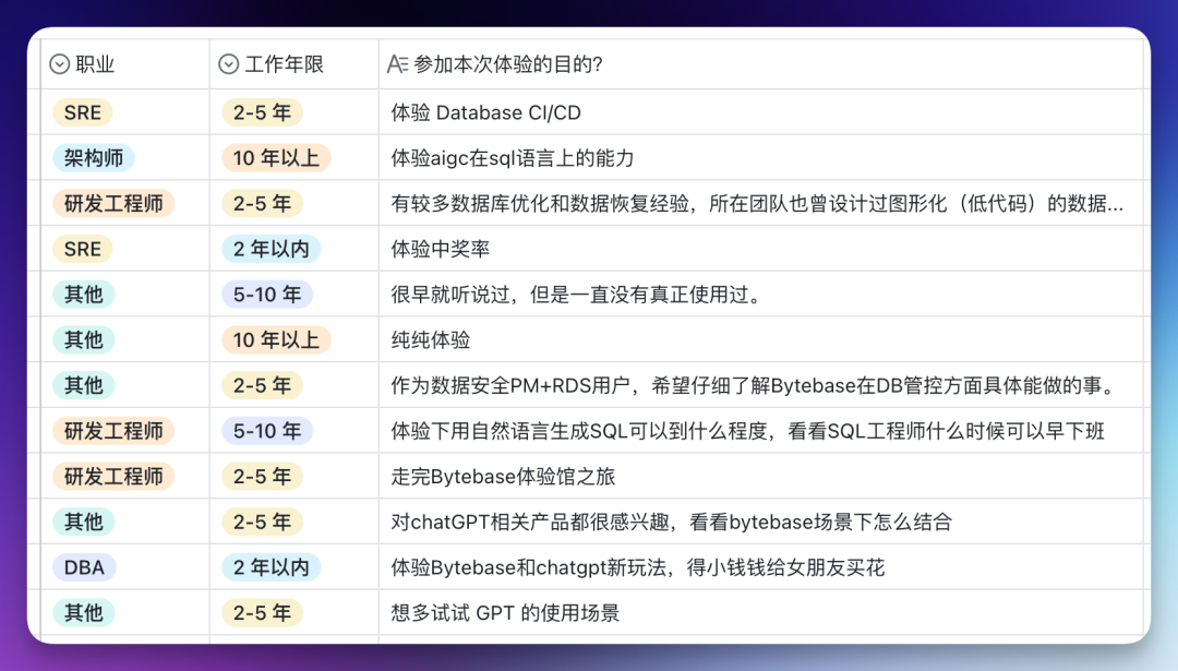 炒香菇的书呆子是一名 DBA,体验目的一栏填写的「体验 Bytebase 和 chatgpt 新玩法,得小钱钱给女朋友买花!」
