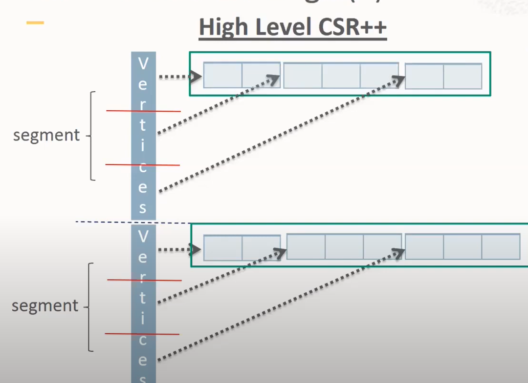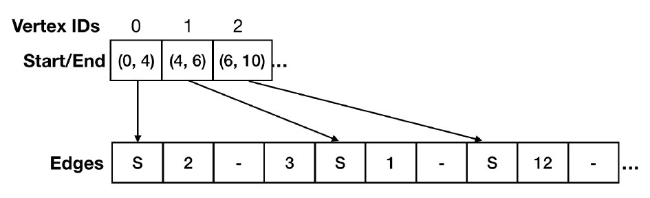 PCSR [3]的基本思想是:对于点矢量,其元素从一个值改为对应边矢量中对应邻边位置的 <起点,终点>。而对于边矢量,在这些分块所对应边界放置哨兵 sentinel,上图中的 S,上图的 “-” 对应预留插入位置留空。