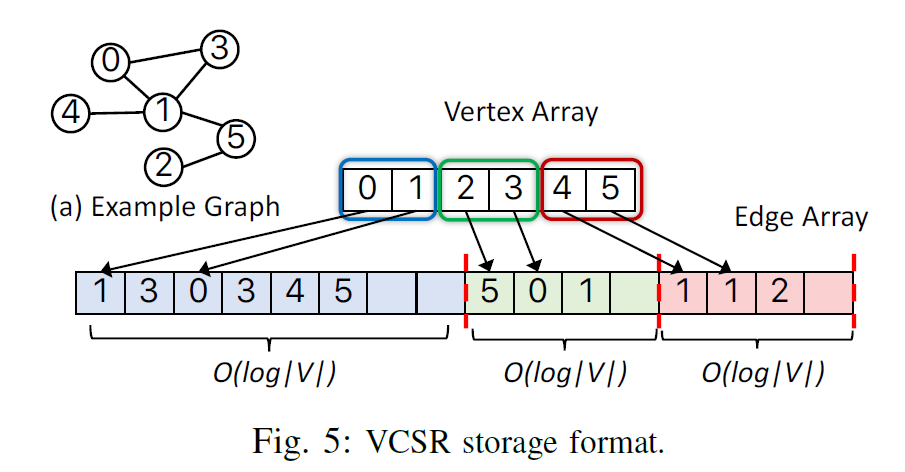 VCSR[4]主要是对 PCSR 的一个改进,其朴素思想是 PCSR 的留空是均匀的,而大多数图结构的出入度,是存在 20-80 这样的幂率特征,而 PCSR 的一个主要痛点是频繁的 rebalance。VCSR 的做法是为每个分块预留空间正比于其分块内的点的数量,即:边矢量中,一个分块内,如果点的数量多,就多预留一些空位。在直觉上,点数量多时,其分块对应的边插入会更多一些,这样可以减少 rebalance 的频率。
