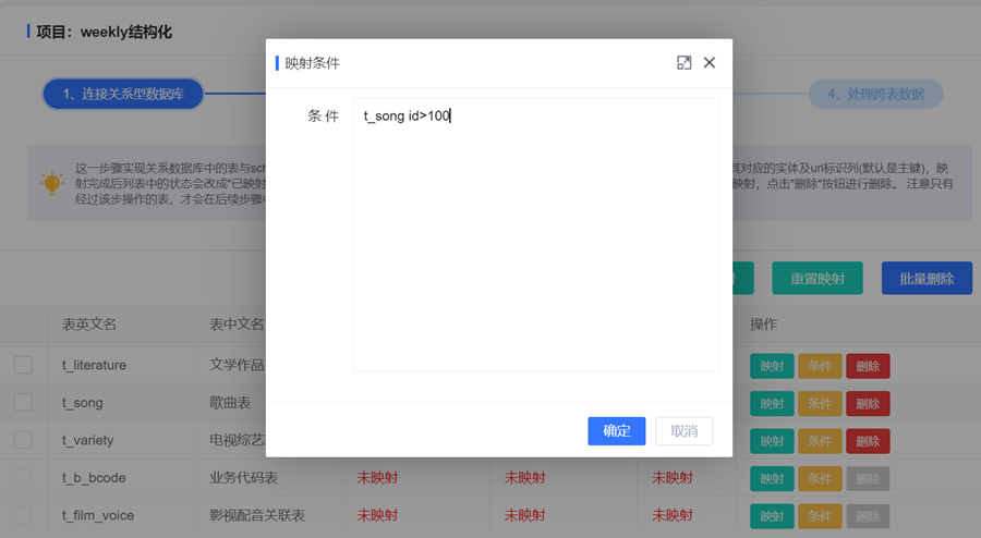 同时,由于可能在结构化抽取过程中会定时抽取,为了避免每次全量抽取,提升抽取效率,我们在本步骤进行映射时也可以增加约束条件,在后面进行映射时就只映射符合约束条件的数据,类似SQL语句中的where条件,我们点击【条件】按钮,在弹出的弹框中编写我们的约束条件,例如我们编写只抽取t_song 表中 id>100的数据,那么后面在抽取该表时就只抽取id>100的数据。